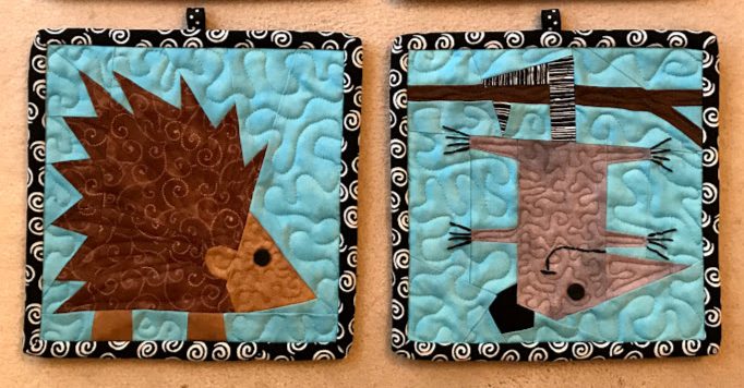 These super sweet penguins wearing a cute collection of different hats make a fun wall hanging or table topper. The penguins are paper pieced, and the flowers are appliqued.