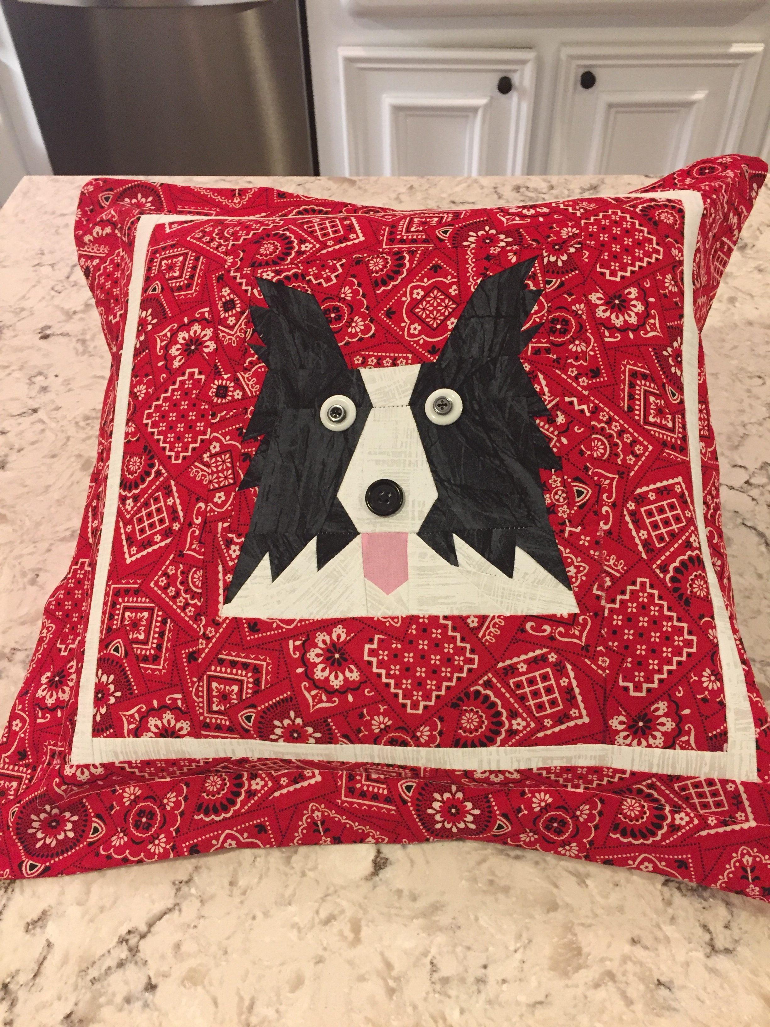 One of my favorite projects is highlighting a paper pieced dog block in a toss pillow. It’s such a great way to add a bit of color to a couch, chair, or bed. It’s also a great conversation piece.