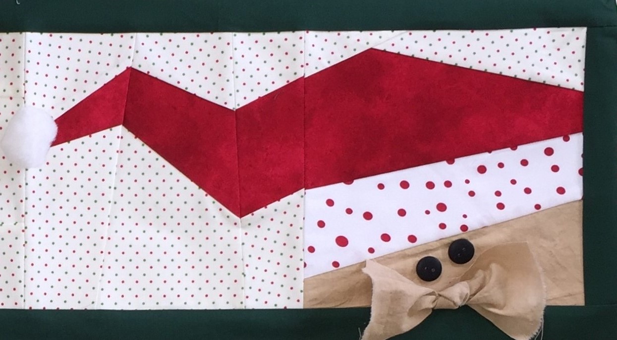 The pattern explains how to tie a “knot nose” using a scrap of muslin. So cute! My finished row shows the “Jolly Old St. Nick” row finished as a table runner with an inner and outer border. Also, consider using just the “HO HO” block for a pillow or potholder!