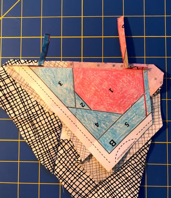 Above, you can see that piece #3 is stitched, pressed in place, and the excess fabric has been trimmed. Continue to add pieces in numerical order.