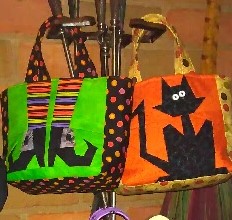 Aren’t these Halloween Trick or Treat Sacks too cute? These were made by my customer, Marilyn. She used an assortment of my Halloween block patterns and the same Gift Sackpattern from my Christmas bookHere’s a close-up of two of the totes. Adorable!