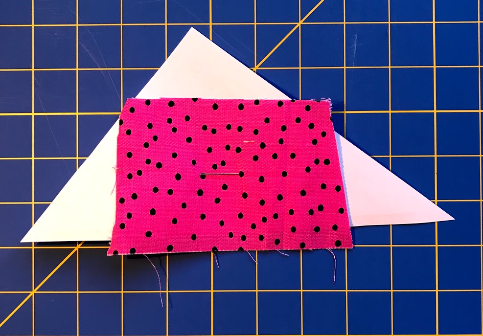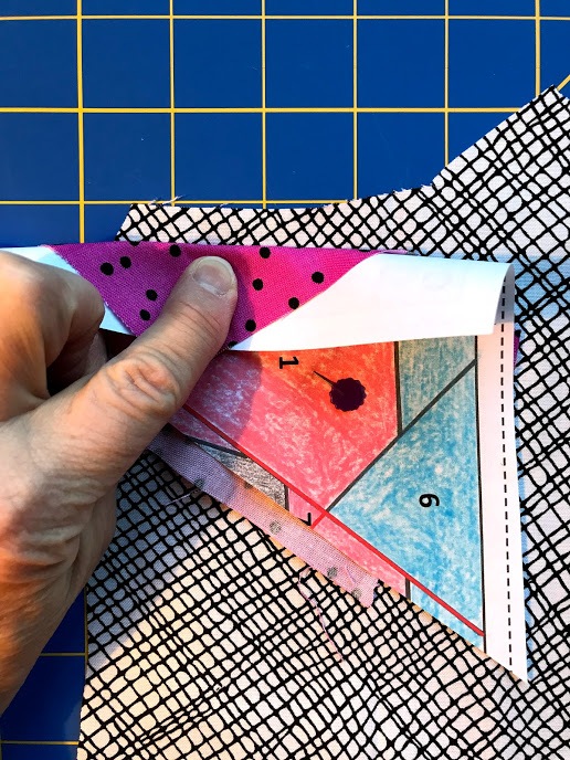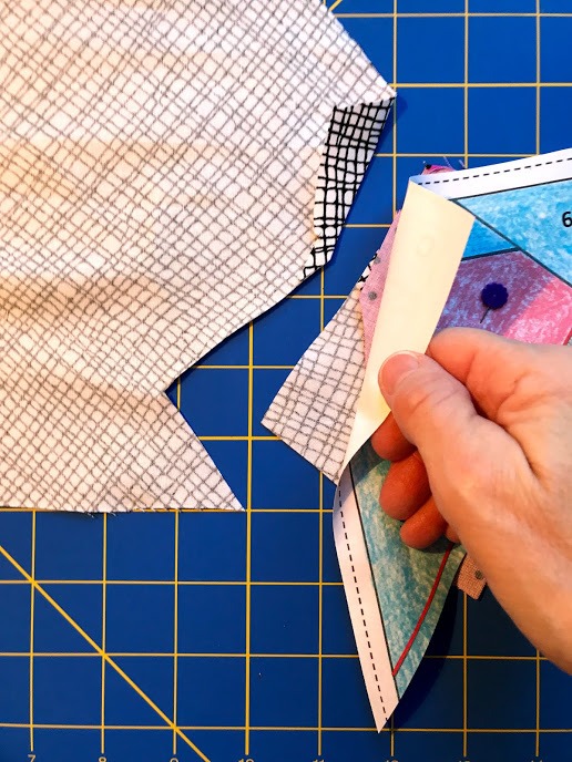 Step 7: Position the fabric for piece #3. Again, I am bending the pattern on the stitching line so I can peek under the pattern to help place my fabric to allow about 1/2″ of seam allowance. (I am always generous with this seam allowance, especially for beginners.)