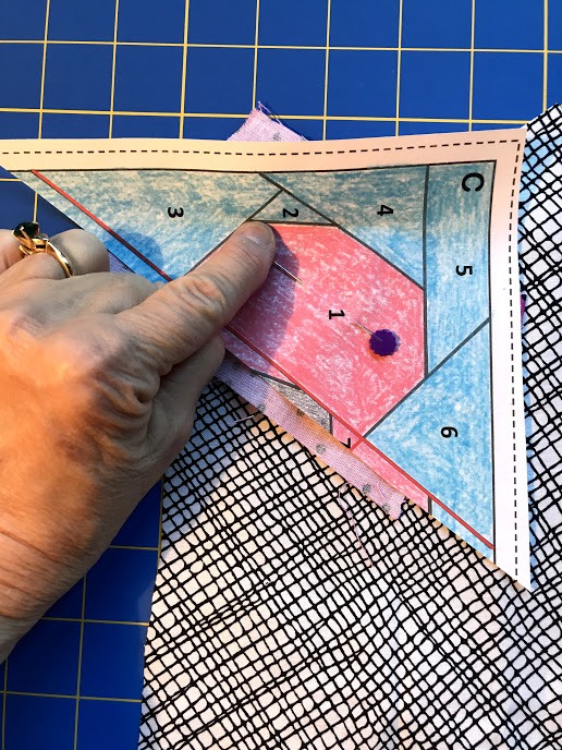 Step 2: Pin a scrap of fabric behind piece #1. Hold the pattern up to a light source so you can position the piece behind piece #1 on the pattern. The right side of the fabric is facing away from the back of the pattern. Note that the scrap is larger than piece #1 to allow for seam allowances.