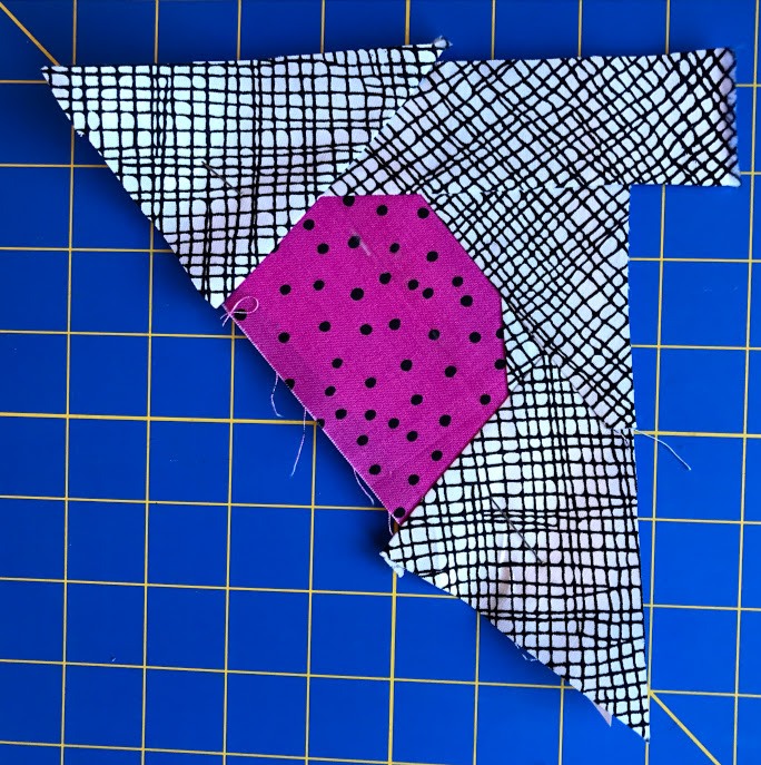 Above, you can see that piece #3 is stitched, pressed in place, and the excess fabric has been trimmed. Continue to add pieces in numerical order.