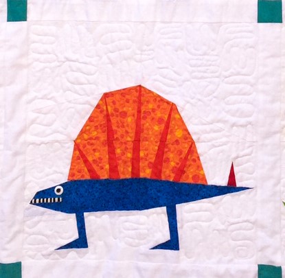 The complements blue and orange worked perfectly in my Spinosaurus. You can see from the photos above how each dinosaur is comprised of 4 paper pieced blocks. In an effort to make this pattern as easy as possible for my customers, I am using a tiny black and white striped fabric for his teeth…because who wants to paper piece all those tiny teeth!